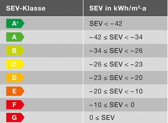 Im Beispiel: Zehnder ComfoAir 350 Luxe mit Zehnder CO2-Sensor, durchschnittlich, also mittlerer Wert: SEV-Klasse A+