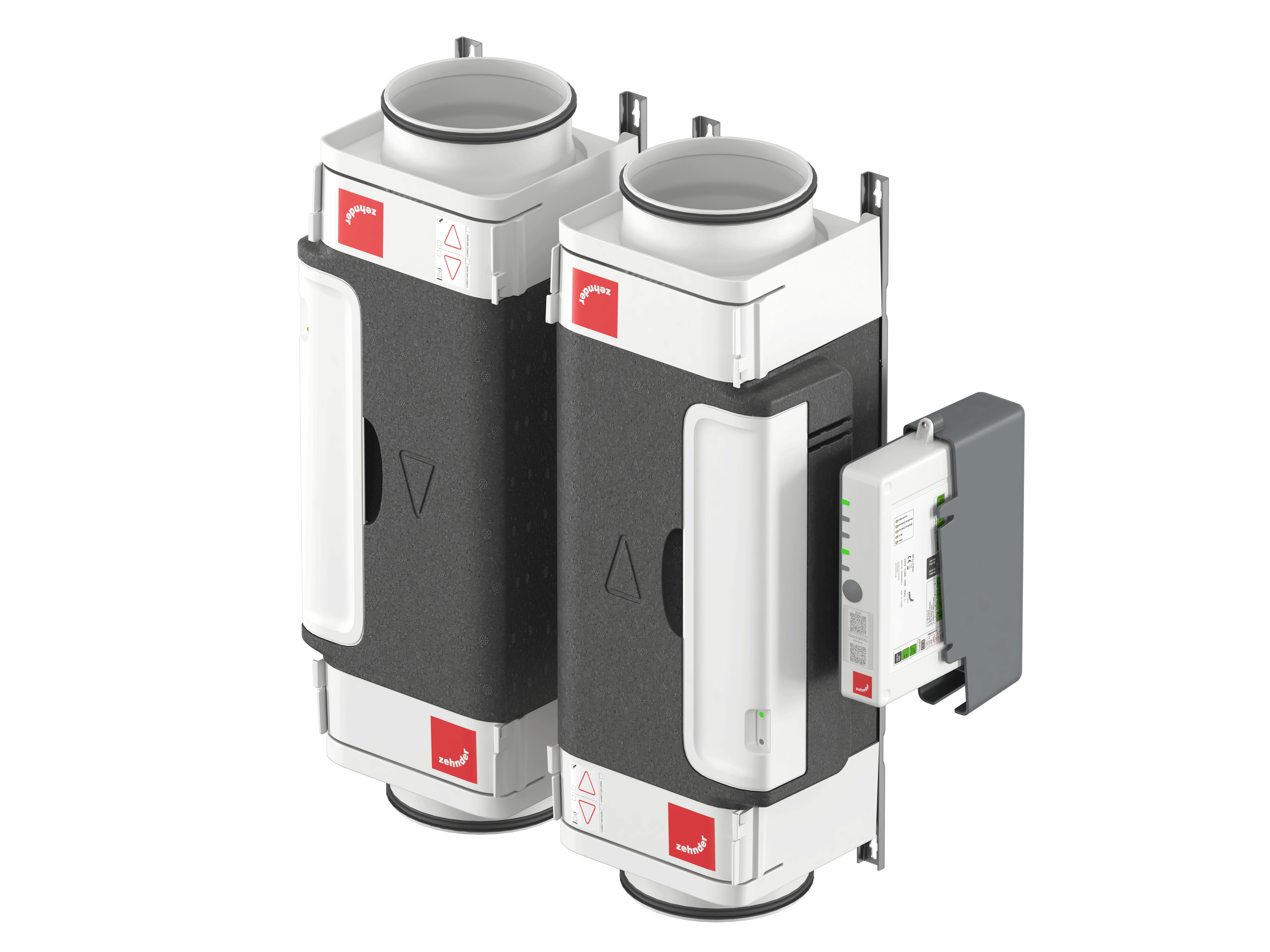 Die Wohnungslüftungsbox Zehnder ComfoVar Aero steuert die von einem zentralen Grosslüftungsgerät in die Wohnung strömende Zu- und Abluft bedarfsgerecht und beansprucht nur wenig Raum und ist im Einbau flexible.