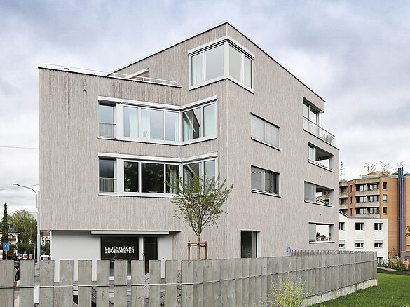 Die Mezzanin-Apartments lassen ein Loft-Feeling aufkommen. Hohe Decken, Wendeltreppen und grosse Fenster zeichnen das Haus aus. Die Fassade hat einen italienischen Touch im Sgraffito-Design.