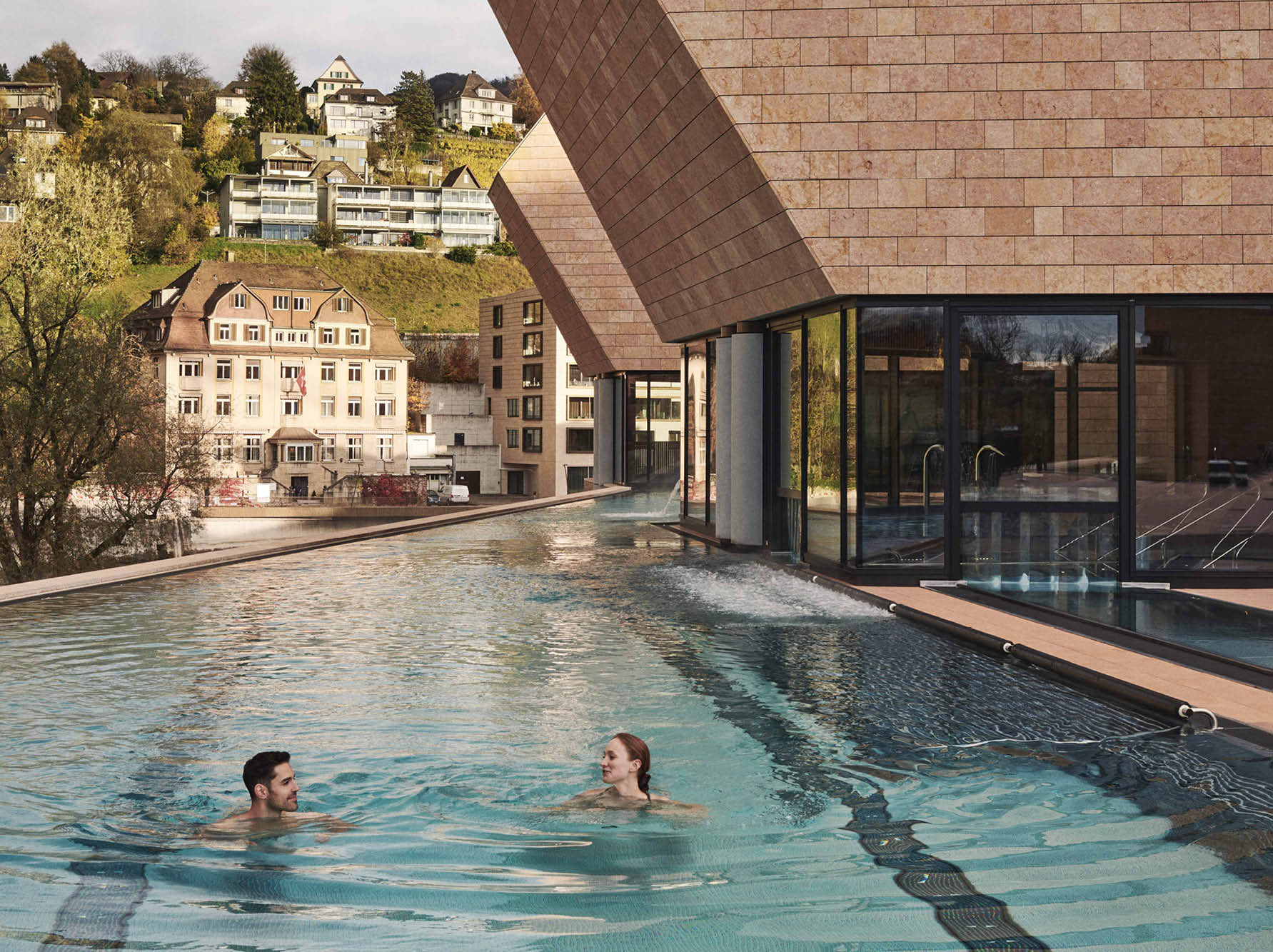 Bereits die Aussenansicht des neuen Wellness-Tempels FORTYSEVEN weckt die Neugierde: Ein 160 Meter langer, in einer Natursteinfassade verpackter Flachbau, gestaltet vom Star-Architekten Mario Botta, wurde im November 2021 eröffnet.