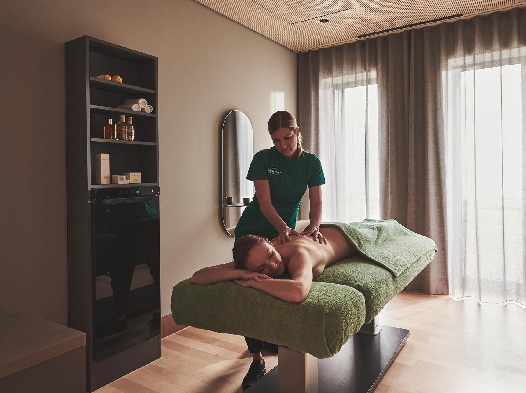 Geschäftsführerin Nina Suma: «Wir bieten dem Besucher einzigartige, optisch-architektonische Eindrücke in Kombination mit einem Wellness-Angebot auf modernstem Technik- und Ausstattungsstandard.» Suma erklärt: «Aufgrund der Positionierung des FORTYSEVEN war es für uns auch wichtig, dass wir ausschliesslich sehr hochwertiges Mobiliar einsetzen, welches gleichzeitig funktional und einfach zu reinigen ist. Schliesslich sprechen wir nicht von einem Hotel mit 30 Zimmern, sondern von einer Therme mit durchschnittlich 800 Tagesbesuchern».