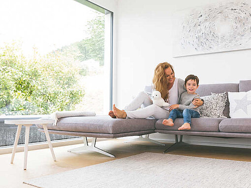 Von aussen gelangt frische Luft ins Haus. Spezialfilter auf Wunsch verhindern das Eindringen von Pollen und vermeiden so allergische Reaktionen. Innen strömt die Luft zum Lüftungsgerät. Das Luftverteil-System leitet sie bedarfsgerecht in die Räume weiter. Gleichzeitig führt das System verbrauchte und zu feuchte Luft zurück nach aussen. Der Clou: Bevor die Abluft wieder ins Freie gelangt, gewinnt ein integrierter Wärmetauscher im Lüftungsgerät etwa 90% Wärmeenergie zurück und gibt diese an die frische Zuluft ab.