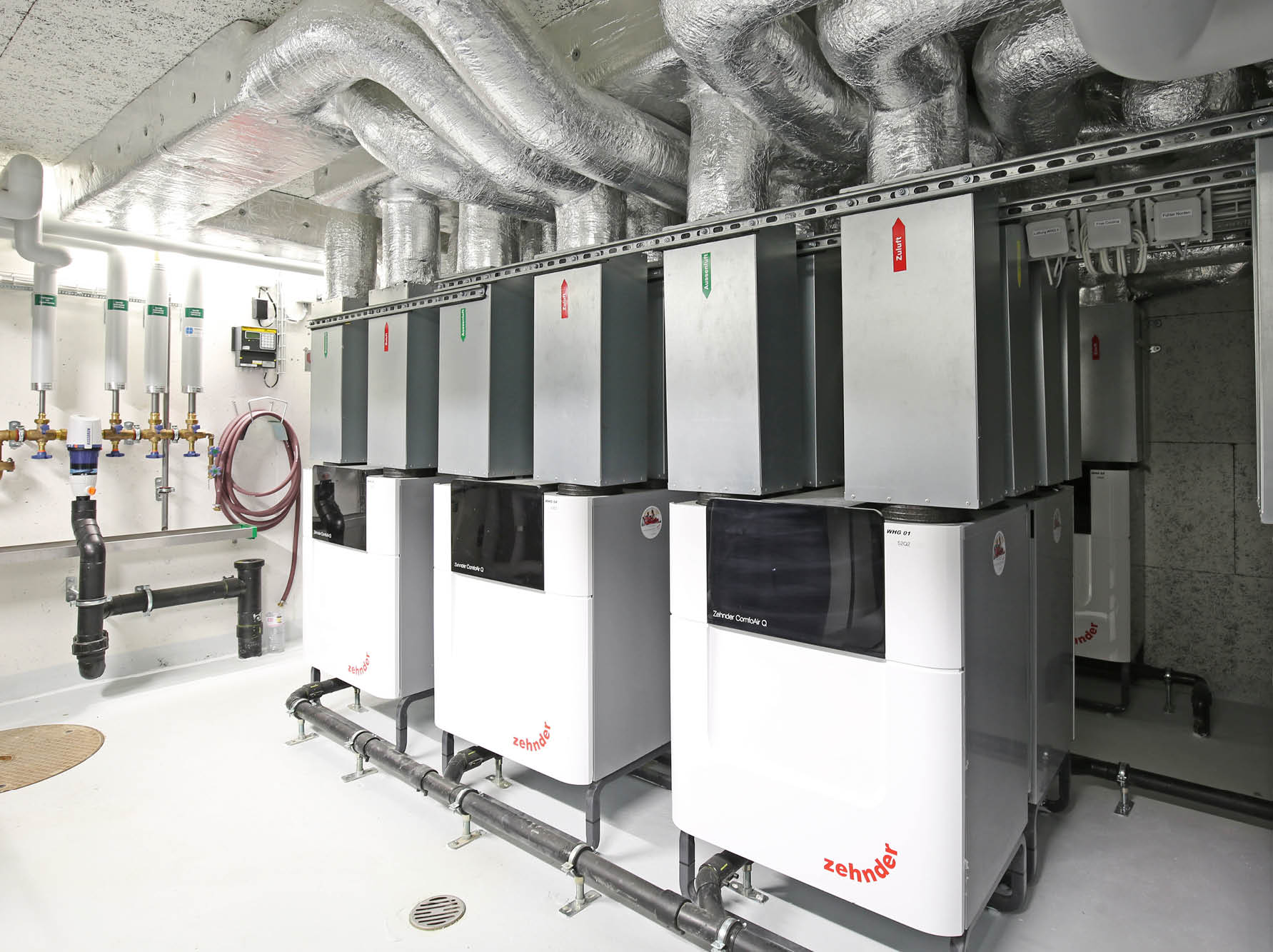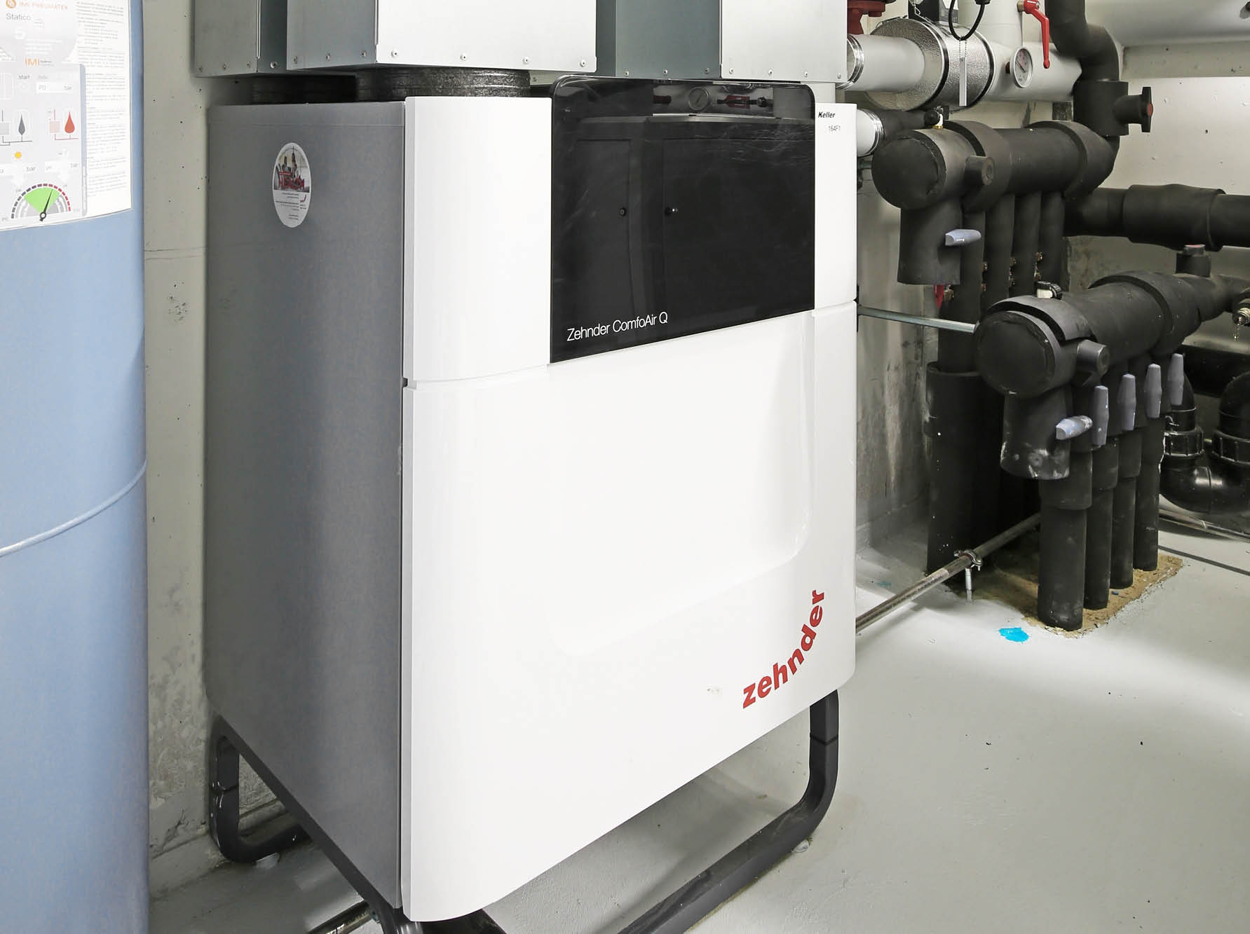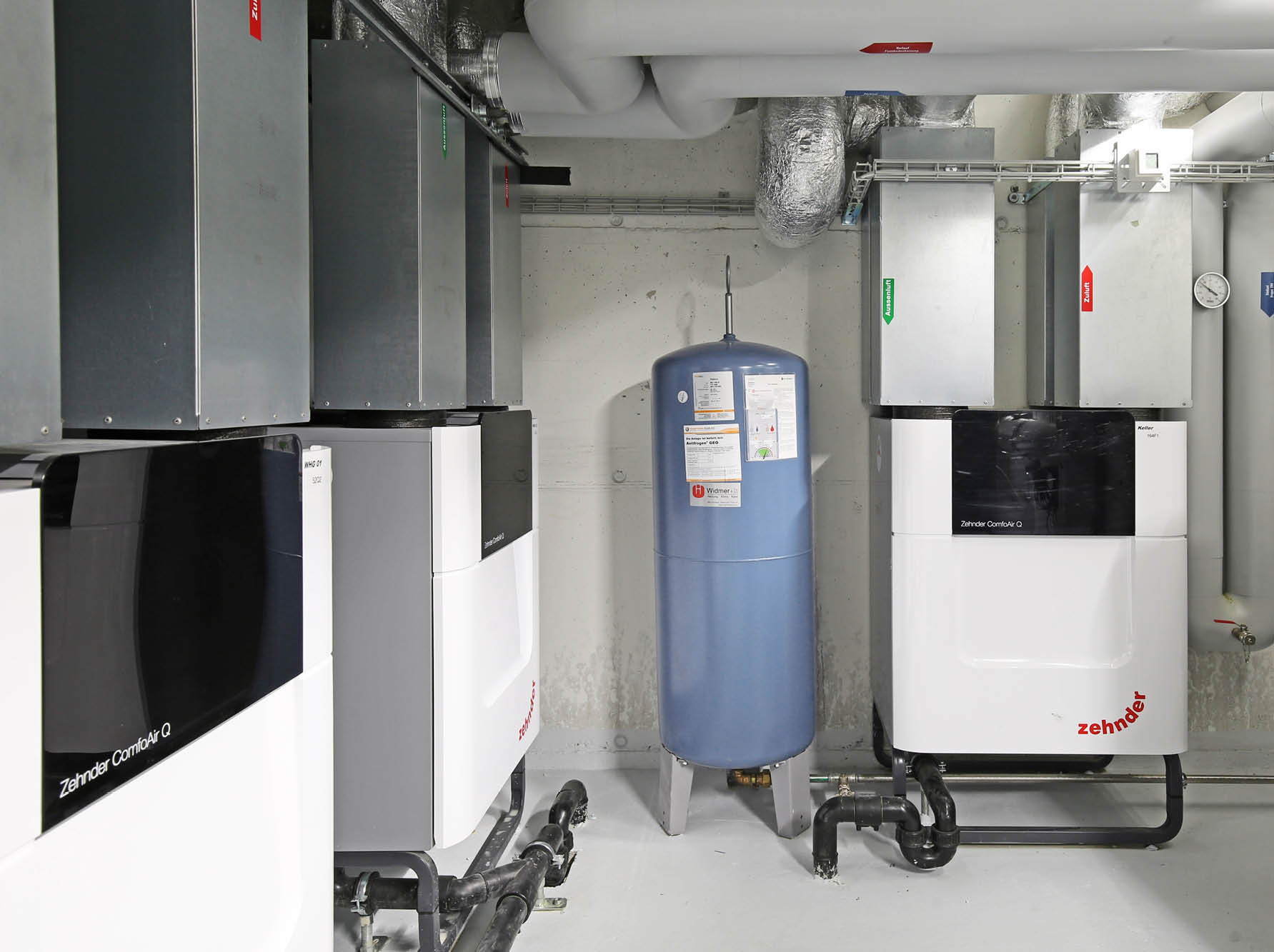 Die Aussenluft wird an der Fassade im ersten Obergeschoss gefasst und von dort in den Technikraum im Souterrain geführt. Dort versorgen zehn Komfortlüftungsgeräte Zehnder ComfoAir Q die Wohnungen konstant mit Frischluft.