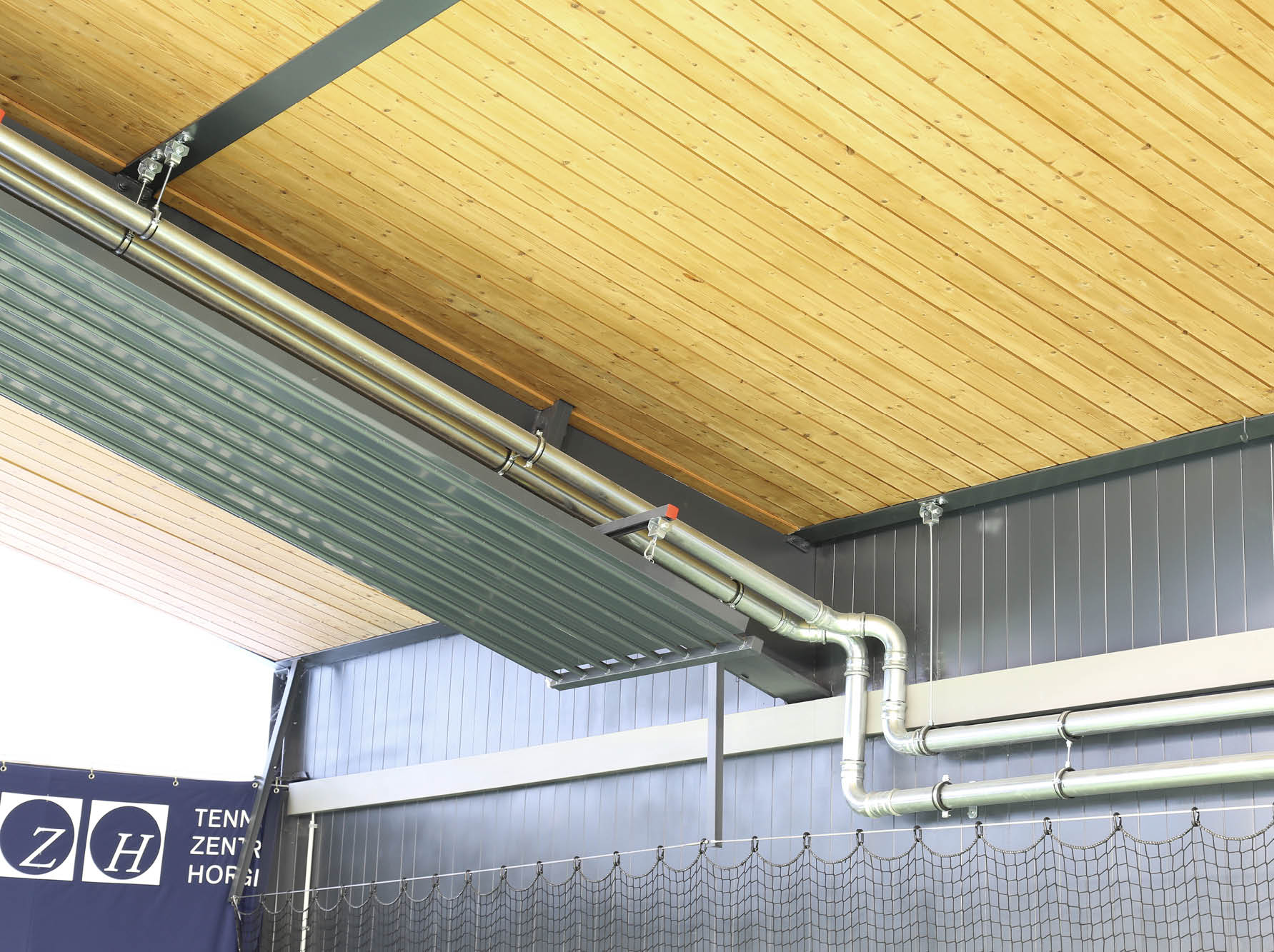 Auch wenn es draussen schneit, herrschen drinnen konstant für den Spielbetrieb optimale 18°C ohne Zuglufterscheinungen. Erreicht wird dies durch besonders energieeffiziente Zehnder ZBN Deckenstrahlplatten.