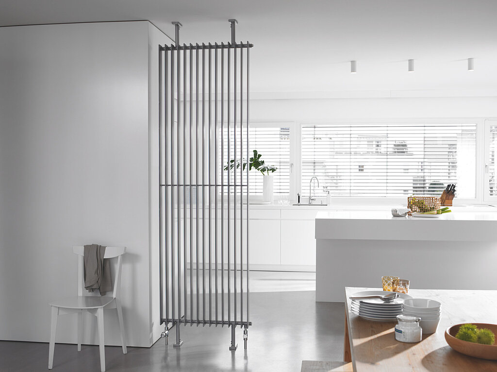 Comme éléments de séparation, les corps de chauffe Zehnder forment un paravent transparent sans faire perdre à la pièce son volume.