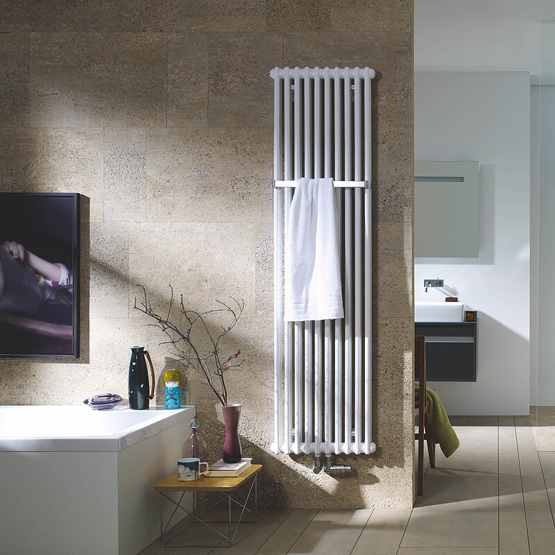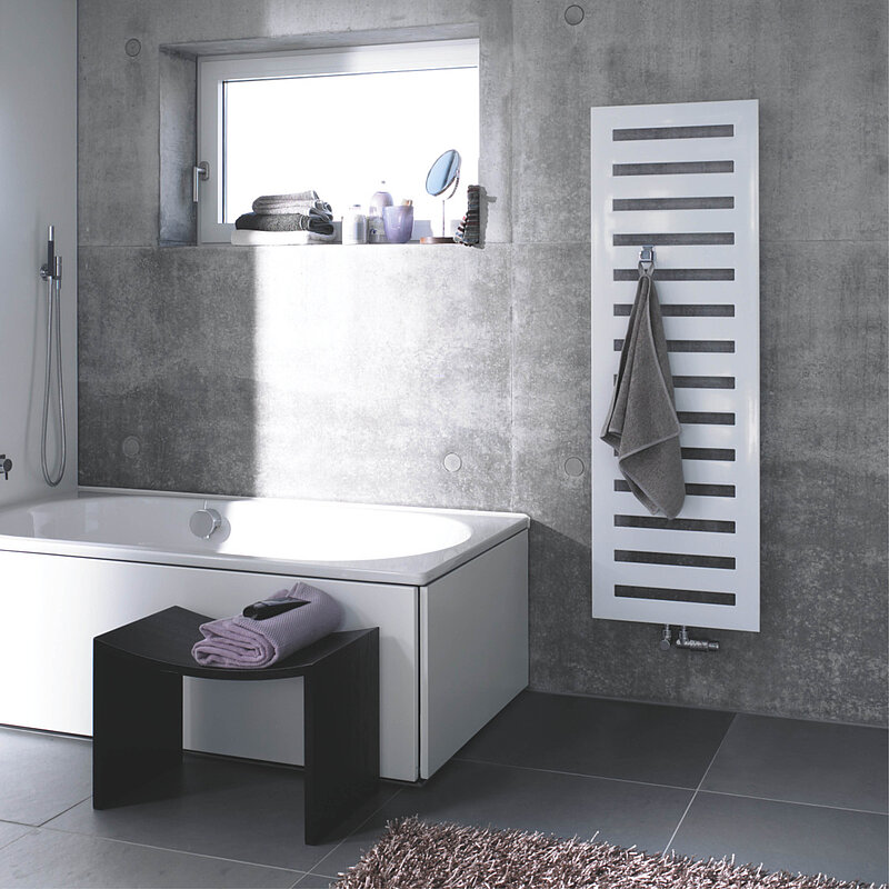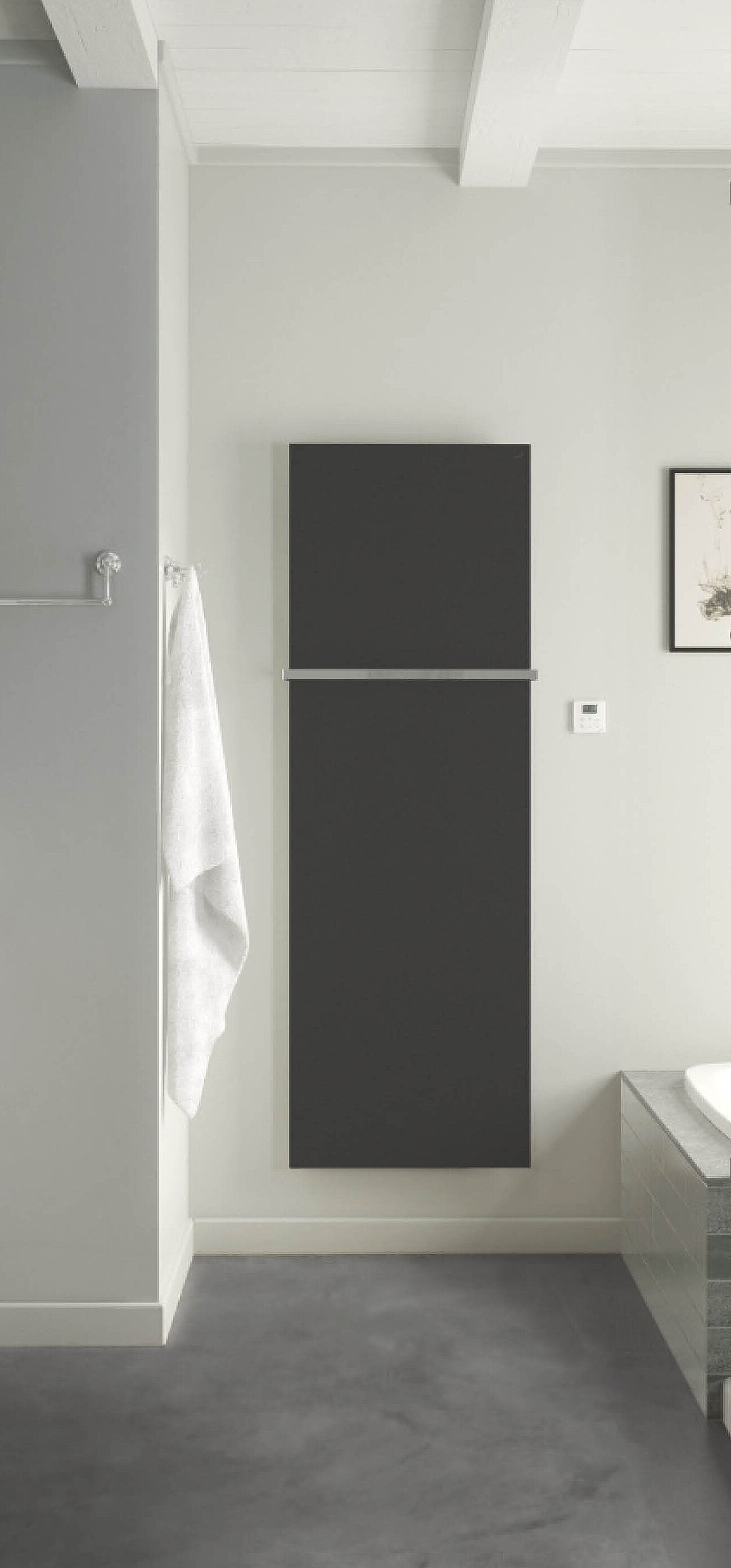 Version de haute qualité en acier, chromée ou dans la teinte du corps de chauffe, avec fixation à deux points dissimulée derrière le corps de chauffe; capacité de charge max. 10 kg.