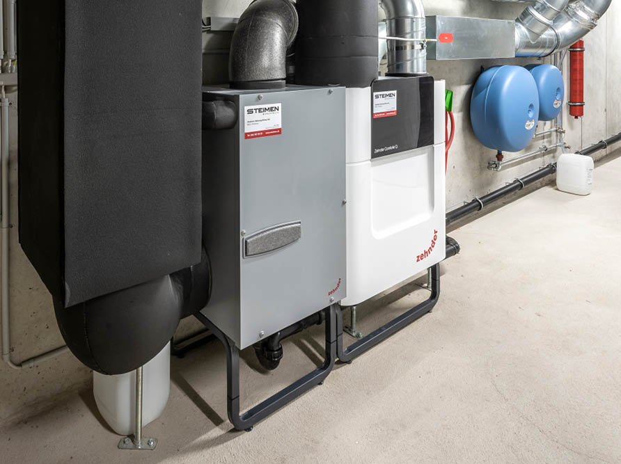 L’appareil de ventilation Zehnder ComfoAir Q se trouve dans la cave. Un tuyau ascendant acheminant l’air neuf et l’air vicié relie les habitations à l’appareil de ventilation. Avec la ventilation de base, l’échange d’air s’effectue avec récupération de la chaleur, comme dans un système de ventilation de confort, ce qui n’est pas possible avec une installation d’évacuation d’air simple.