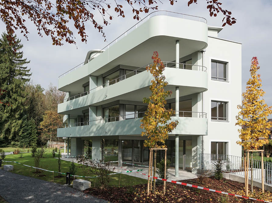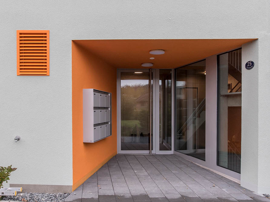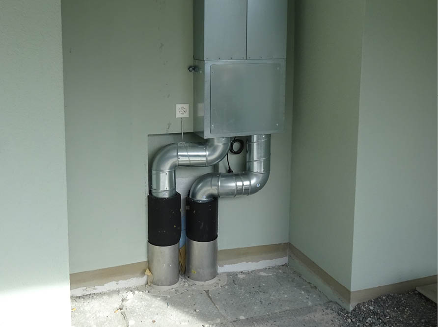 L’alimentation en air de chaque habitation s’effectue via des caissons de ventilation de l’air ambiant insonorisés de type Zehnder ComfoVar. Ceux-ci régulent l’apport d’air neuf et ne nécessitent qu’un espace restreint dans les différents logements. Les habitants peuvent sélectionner confortablement l’intensité de ventilation à l’aide d’un interrupteur à trois positions
