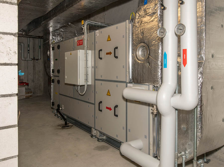 L’appareil de ventilation grand volume placé à la cave peut, grâce à sa construction modulaire, être adapté aux besoins réels du projet. Il est doté de nombreuses fonctions intelligentes et innovantes. L’air neuf est prétempéré par la pompe à chaleur avec sondes géothermiques, qui commande le fonctionnement d’une batterie de post-chauffage. La récupération de chaleur de l’air vicié s’élève à environ 90 %. Pour les journées d’été particulièrement chaudes, l’appareil dispose d’un by-pass en standard.