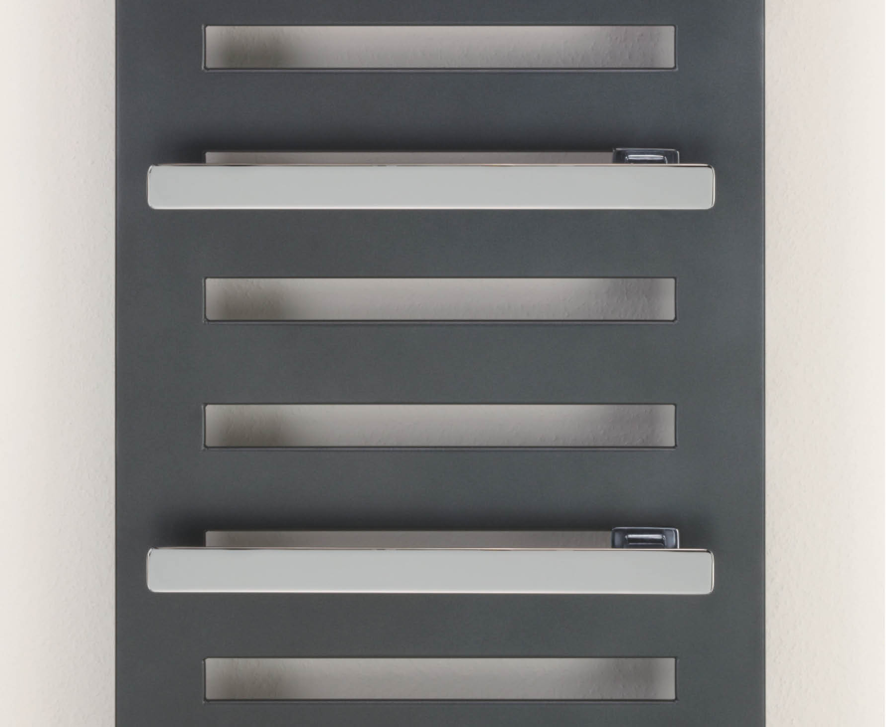 Versione pregiata in acciaio, cromato o nel colore del corpo riscaldante, con fissaggio a 2 punti nascosto dietro il corpo riscaldante; capacità di carico max. 10 kg.