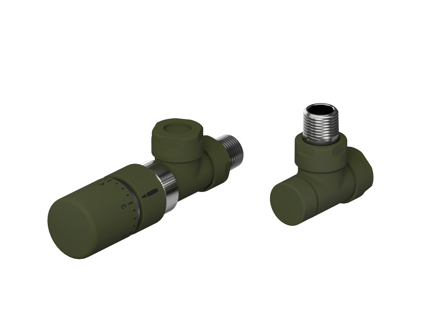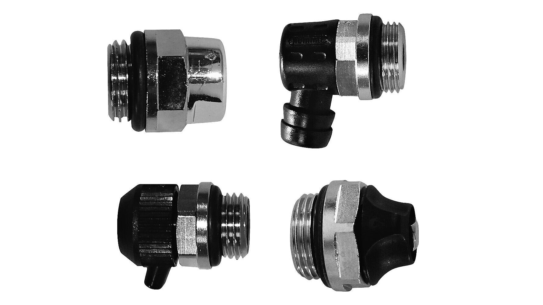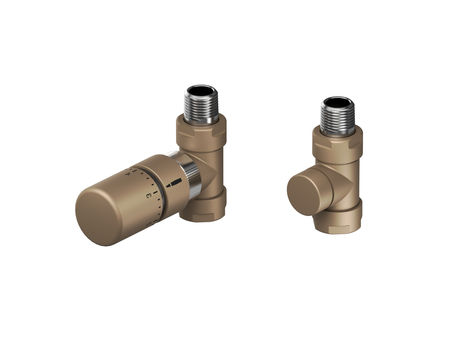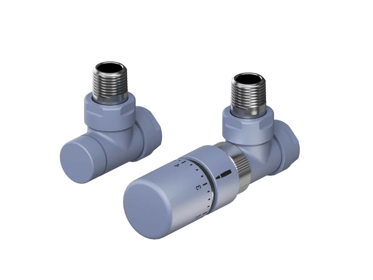 Sono disponibili vari set di valvole con corpo valvola e avvitatura ritorno, compresi 2 raccordi di riduzione da 1/2 pollici per corpi riscaldanti e dadi per raccordo sul lato uscita con la stessa finitura del corpo valvola.