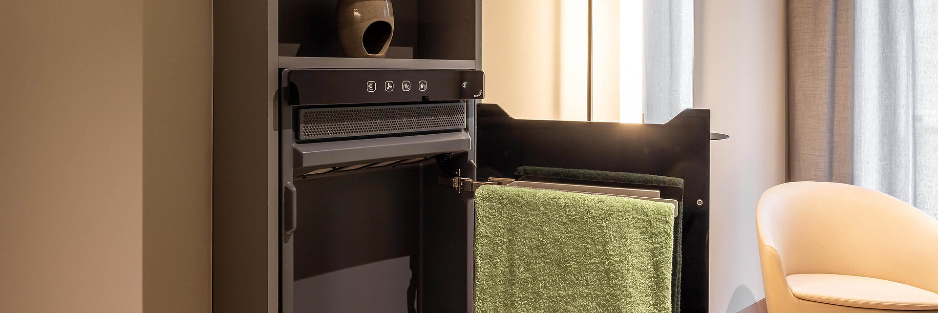 Per le sale dei trattamenti cosmetici nella zona spa, la proprietà cercava un prodotto in grado di preriscaldare e asciugare gli asciugamani che fosse poco ingombrante e installabile facilmente anche dopo il completamento dell’involucro edilizio.