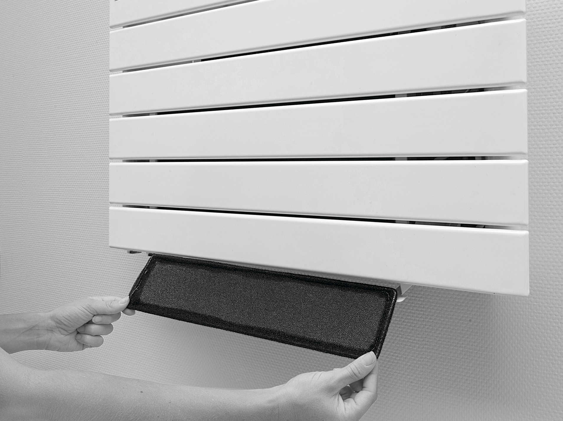 Il corpo riscaldante rileva autonomamente la modalità operativa attuale, riscaldamento o climatizzazione, e attiva un ventilatore all’occorrenza. Grazie alla netta separazione tra riscaldamento e climatizzazione è stato possibile realizzare un sistema di distribuzione molto semplice e a costi contenuti. L’utente può creare un clima confortevole ottimale grazie al ventilatore silenzioso con regolazione a tre livelli. Inoltre i filtri integrati migliorano notevolmente l’igiene dell’aria.