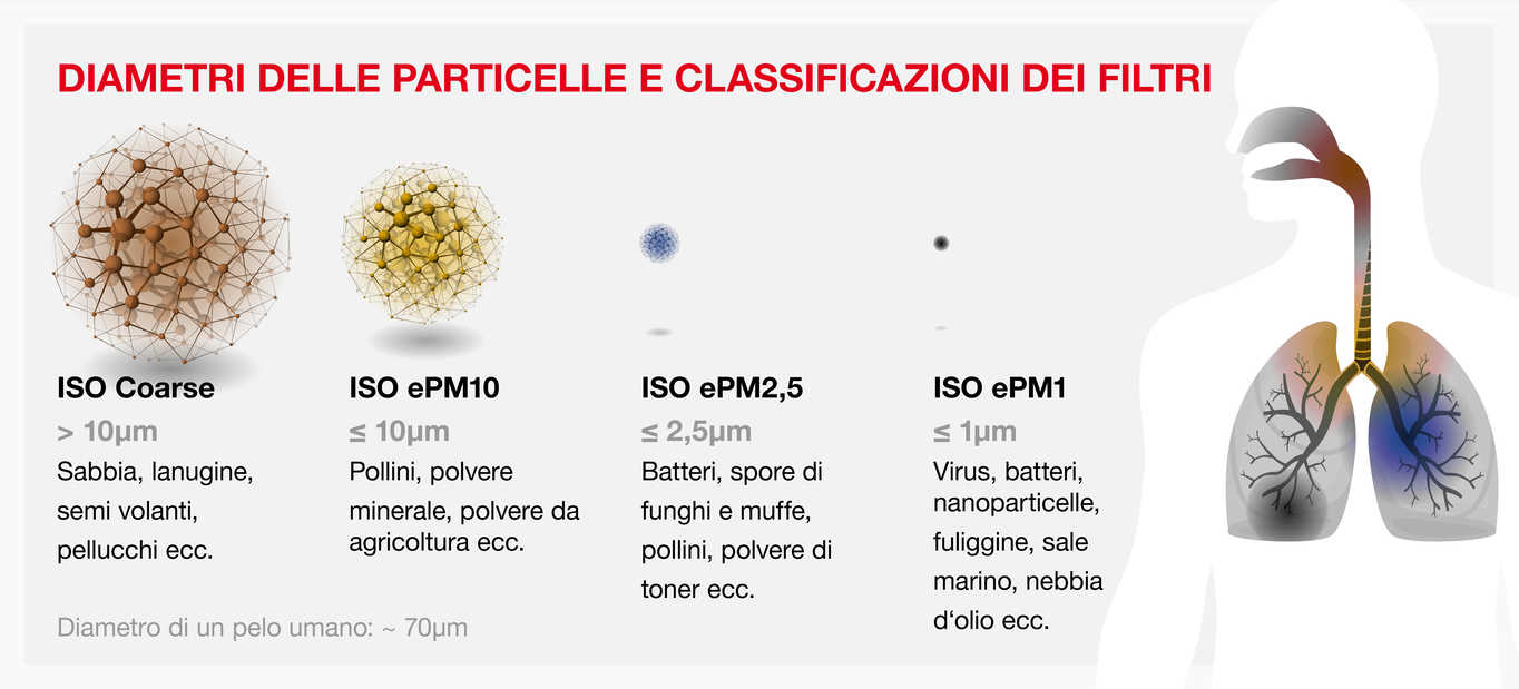 La nuova classificazione dei filtri rappresenta molto meglio la realtà per quanto riguarda l’aria esterna e misura anche le particelle più piccole. Non è possibile trasporre direttamente il vecchio sistema nel nuovo, perché il nuovo standard dipende dalle caratteristiche individuali del filtro. La nuova norma elimina le denominazioni conosciute quali F7 o M5. Ora le nuove classi di filtri sono ePM10, ePM2,5 ed ePM1.