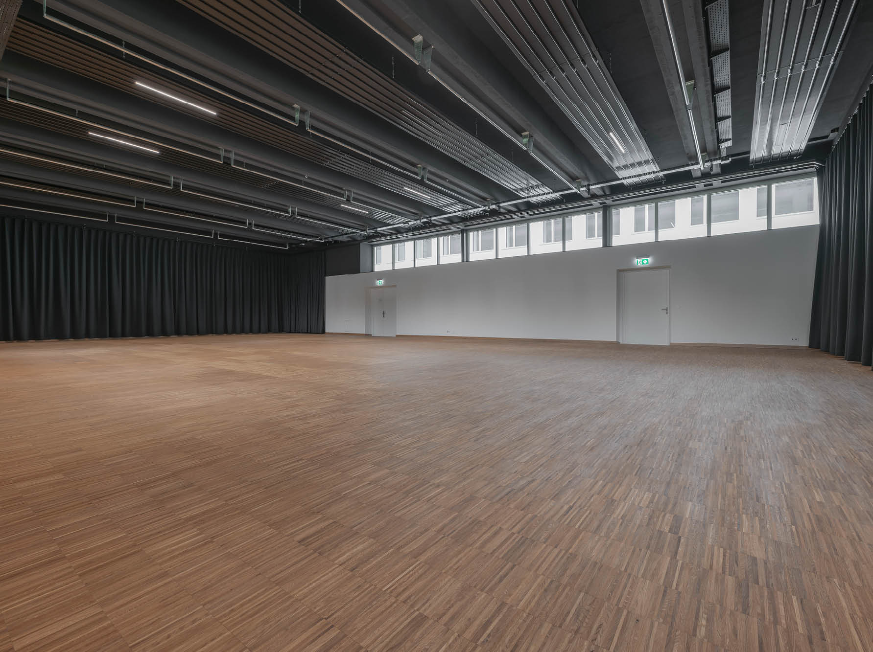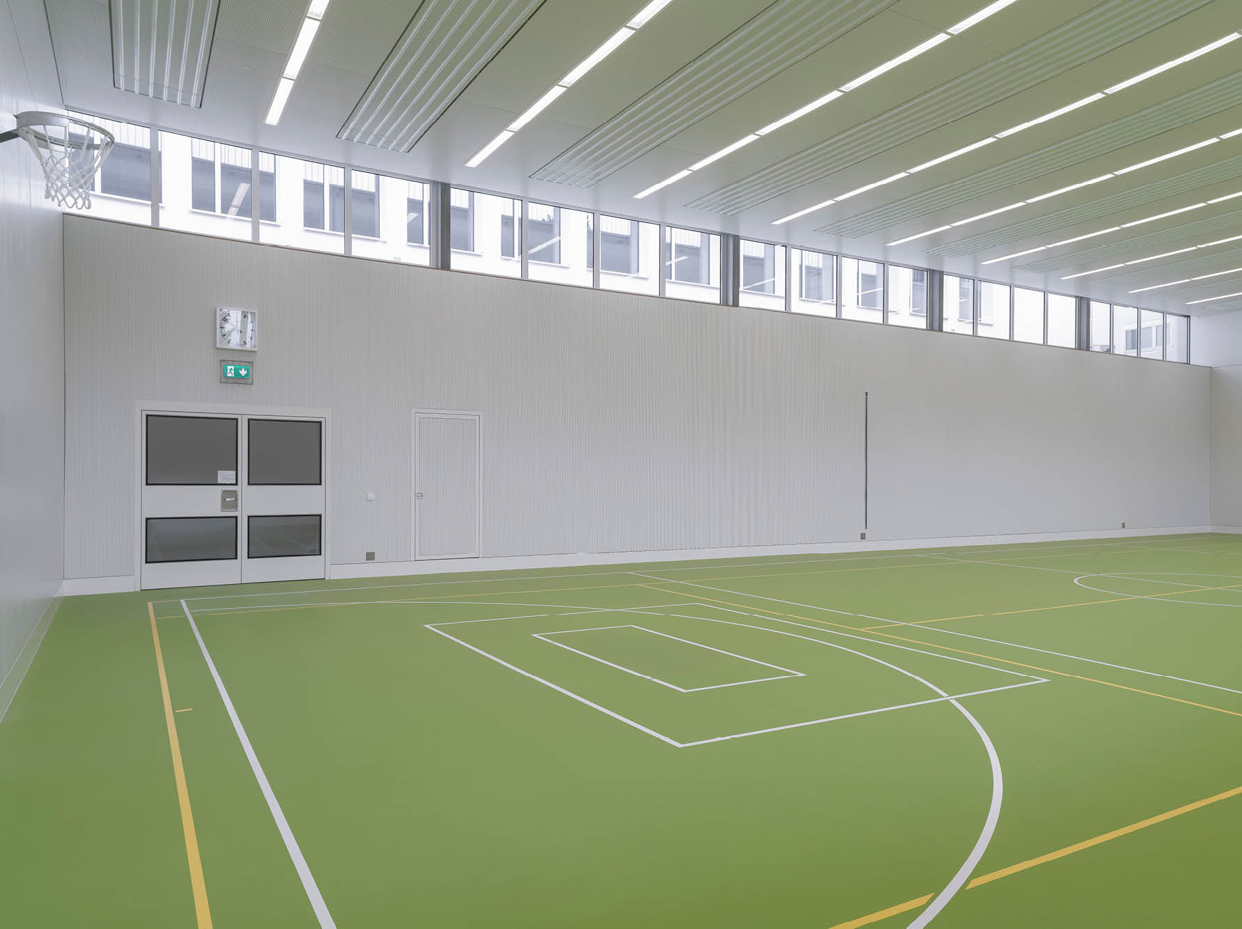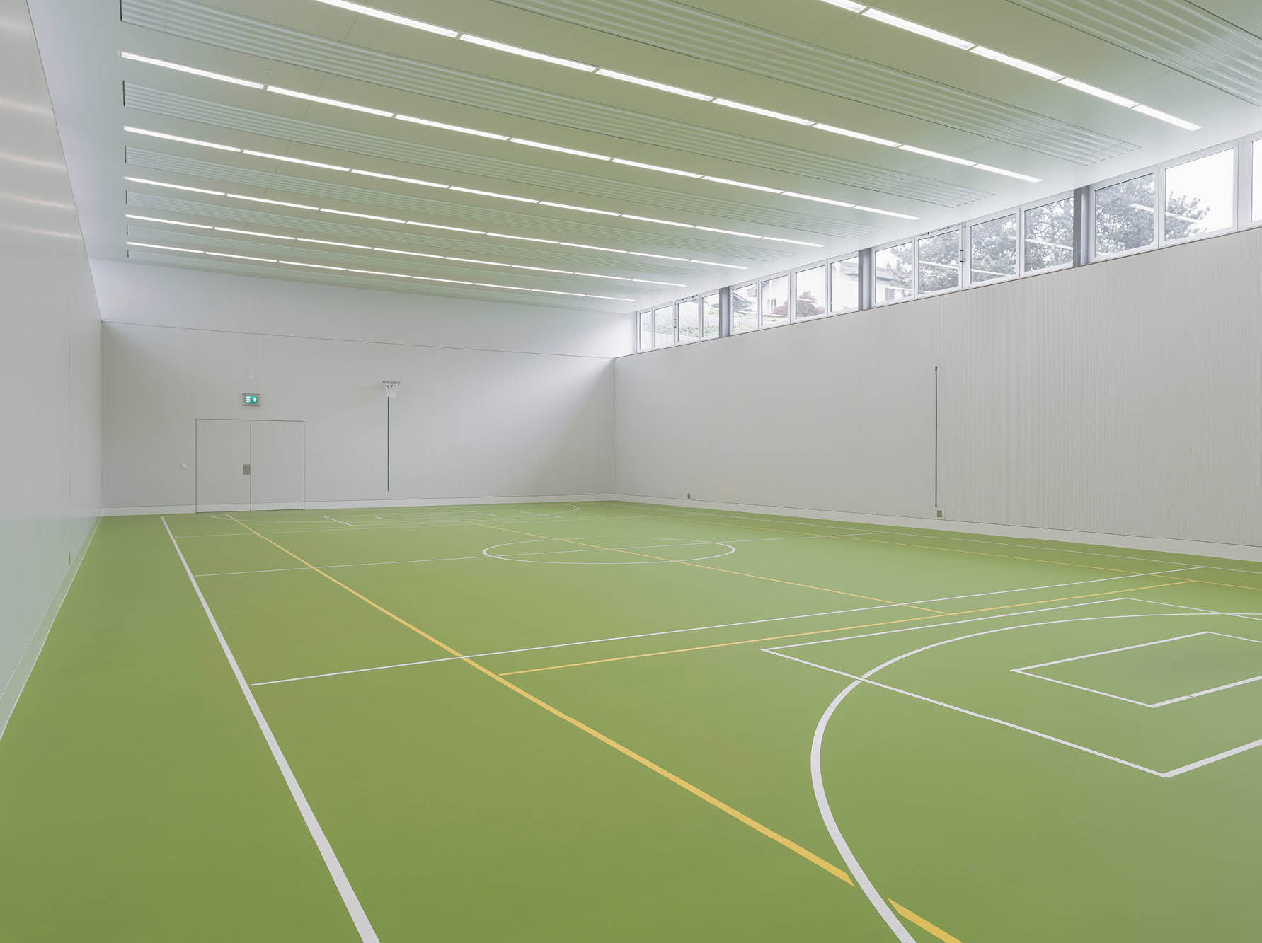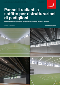 Nel padiglione sportivo sotto stati fissati in totale dieci pannelli radianti Zehnder modello ZBN direttamente a filo sotto il tetto con dei moschettoni. In tal modo i palloni non si fermano sui pannelli. Nel centro polivalente i pannelli radianti a soffitto Zehnder sono stati fissati al tetto del padiglione in modo «convenzionale» con dei moschettoni. Il tecnico progettista Schuler riassume soddisfatto: «I pratici kit di montaggio e l’assistenza eccellente del produttore hanno consentito di installare tutti i 18 elementi a soffitto e di mettere in funzione gli impianti nell’arco di quattro giorni lavorativi, con una squadra ridotta di due montatori su due piattaforme elevatrici.»