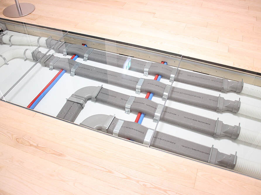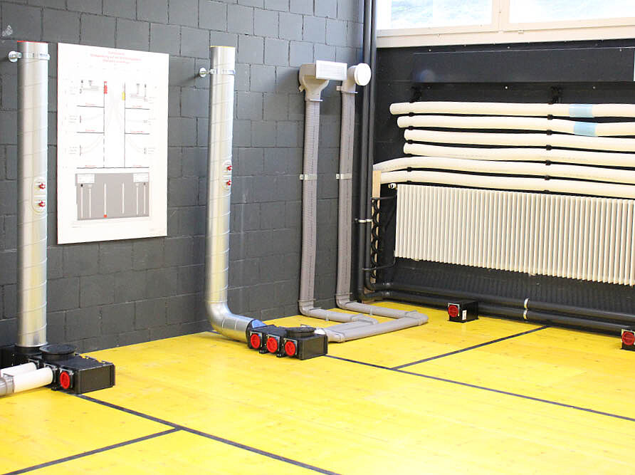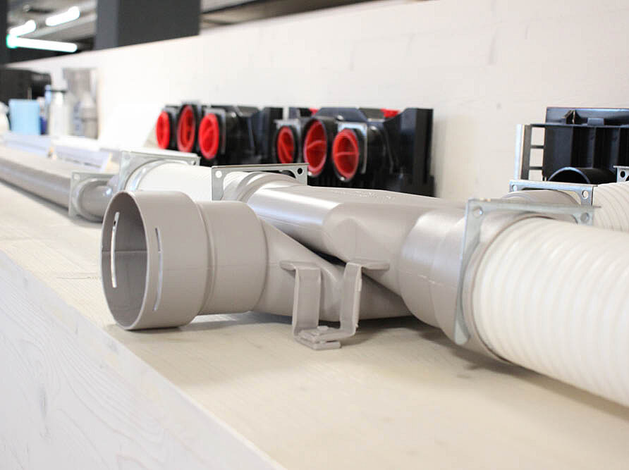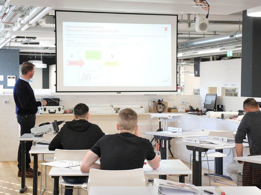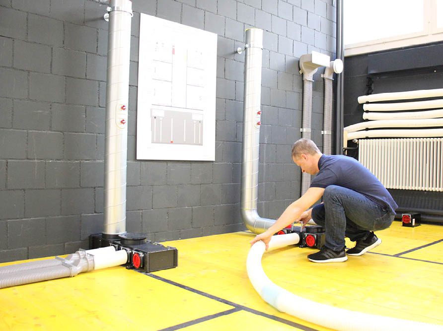 Tutti i componenti della distribuzione dell’aria di un sistema di ventilazione comfort sono a disposizione dei partecipanti al corso sul livello di cassaforma replicato. In questo modo, un sistema di distribuzione dell’aria può essere allestito e illustrato in loco. Durante l’esercitazione pratica, i partecipanti riceveranno molti consigli pratici per l’installazione.
