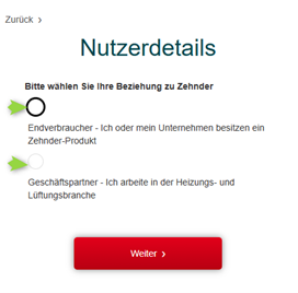 Bei der Erstellung Ihres Zehnder Nutzerkontos können Sie zwischen einem Endverbraucher- und einem Geschäftspartner-Konto wählen.